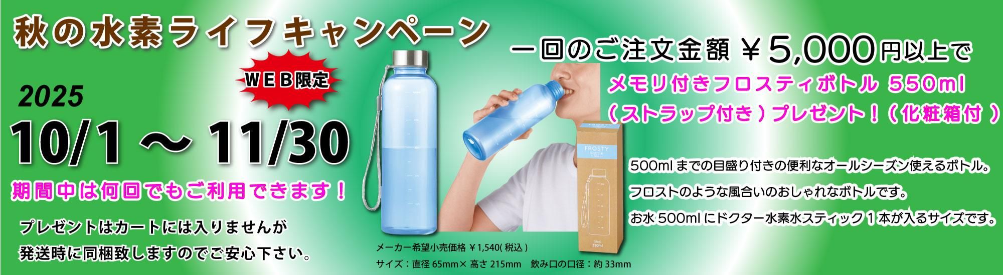 - ◆◆10月〜11月水素生活キャンペーン◆◆【2025年10月1日〜2025年11月30日まで】全品対象で1回のご注文金額5,000円以上で「フロスティボトル」1本(カラー:ブルー限定)をプレゼント!カートには表示されませんが発送時に同梱させて頂きます。期間中は何回でもご利用頂けるWEB限定のキャンペー ンとなります。